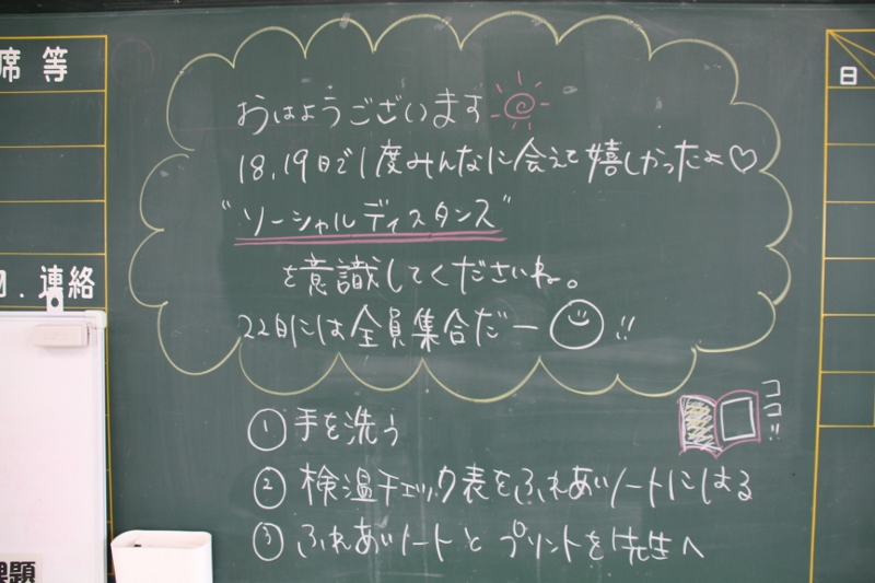 各学級担任が工夫して子どもたちを迎えています 投稿日時 : 2020/05/21 主担 各学級担任の先生が書いた黒板メッセージです。IMG_1559 (800x533).jpgIMG_1561 (800x533).jpgIMG_1563 (800x533).jpgIMG_1564 (800x533).jpgIMG_1565 (800x533).jpgIMG_1566 (800x533).jpgIMG_1567 (800x533).jpgIMG_1568 (800x689).jpg {{options.likeCount}} {{options.likeCount}}