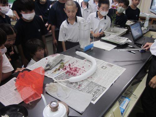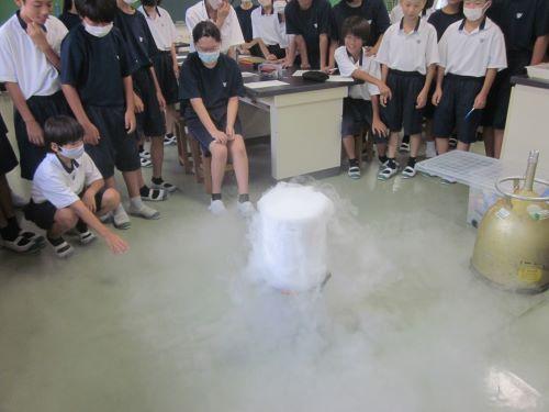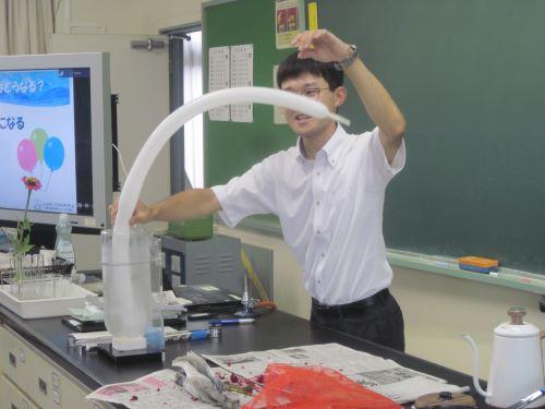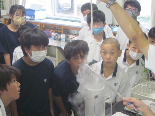 授業 液体窒素で学ぶ(1年理科) 投稿日時 : 2023/09/07 主担 物質の状態変化の授業を紹介します。物質は冷えると分子の運動が鈍くなり、状態が変化することは知られています。この単元の導入では、液体窒素を使った興味のある実験で生徒たちの心をゆさぶりました。液体窒素の中に花、新聞紙、お湯、ゴム風船を入れるとどうなるかを考えました。特に、しぼんだり、もとに戻ったりするゴム風船の様子から、「どうして?」とその理由をこれから追究していく生徒を楽しみにしています。 {{options.likeCount}} {{options.likeCount}}