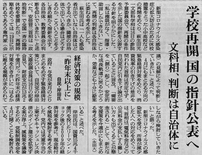 世間では、現在の臨時休業中の授業を夏休みに授業を行えばよいとの意見も聞こえてきます。教師は夏休み中は基本的に、生徒と同じように休みではありません。昨年、教員に夏休み期間中に「休日をまとめ取りせよ」という通称「変形労働時間制」法案が導入されたばかりですが、授業をすることは可能です。ただし、教員研修や免許更新、部活動の大会は夏休み中に行われますので、独断ではなく慎重に考えなければなりません。それよりも、この臨時休業中、不要不急の外出を避けていたまじめな生徒が、夏休みにストレスをためないか、学校を余計嫌いにならないか心配です。