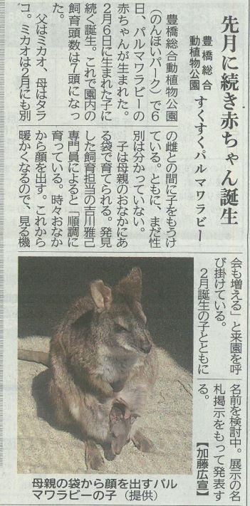 パルマワラビー 投稿日時 : 2021/03/20 主担 カテゴリ:今日の出来事 (令和3年3月17日 東愛知新聞より) 豊橋総合動植物公園では、2月にパルマワラビーの赤ちゃんが生まれましたが、またまた3月に生まれました。3月だんだんと温かくなってきました。豊橋総合動植物公園にでかけてみませんか。 {{options.likeCount}} {{options.likeCount}}