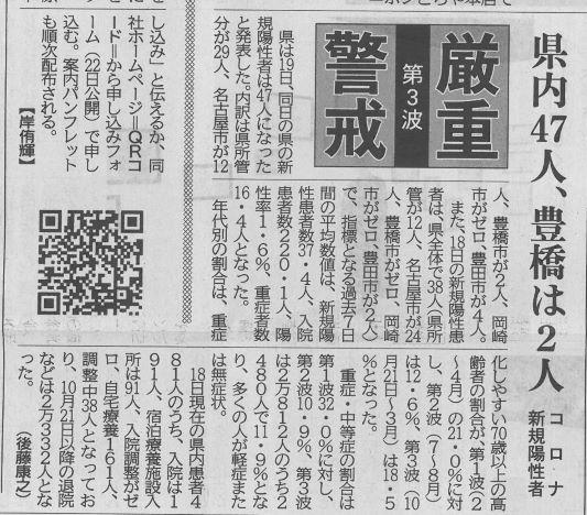 昨日の愛知県は 投稿日時 : 2021/03/20 主担 カテゴリ:今日の出来事 (令和3年3月20日 東愛知新聞より) 昨日の新型コロナ新規陽性者数は、愛知県47人、豊橋2人でした。21日には、愛知県の厳重警戒宣言が、関東地方でも緊急事態宣言が解除されます。まだワクチン接種は、一部の医療従事者にまでしか行き届いていなくて、今後の感染拡大が心配です。オリンピックも海外からの観客を呼ばないことになりそうです。不安材料ばかりですが、感染防止対策はしっかりして、春を迎えましょう。 {{options.likeCount}} {{options.likeCount}}