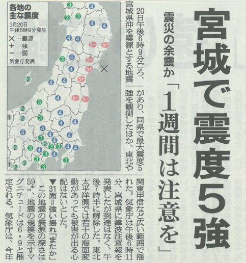 震度5強 投稿日時 : 2021/03/22 主担 カテゴリ:今日の出来事 (令和3年3月21日 朝日新聞より) 20日夕方、宮城県県沖震源の震度5強の地震がありました。東日本大震災から10年経ちましたが、その余震ではないかと考えられています。地球の46億年の歴史で考えると、10年は一瞬なのかもしれません。 {{options.likeCount}} {{options.likeCount}}