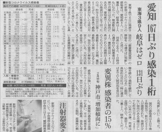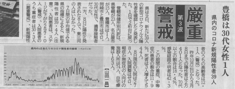 新規陽性者数 投稿日時 : 2021/03/10 主担 カテゴリ:今日の出来事 (令和3年3月10日 東愛知新聞より) 昨日の新型コロナの新規陽性生者数は、愛知県39人、豊橋では1人でした。一昨日の1桁は、やはり日曜日の結果であって、少なく出ただけでした。東京では、緊急事態宣言がまだ解除されていませんが、下げ止まりで若干の増加傾向が見られて心配です。 {{options.likeCount}} {{options.likeCount}}