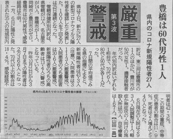愛知県の新規陽性者数 投稿日時 : 2021/03/08 主担 カテゴリ:今日の出来事 (令和3年3月8日 東愛知新聞より) 愛知県の新型コロナ新規陽性者数は27人、豊橋も1人と減少状態で落ち着いています。2週間前の結果が出るということなので、緊急事態宣言解除後から2週間となる来週月曜日からの結果を注視したいです。 {{options.likeCount}} {{options.likeCount}}