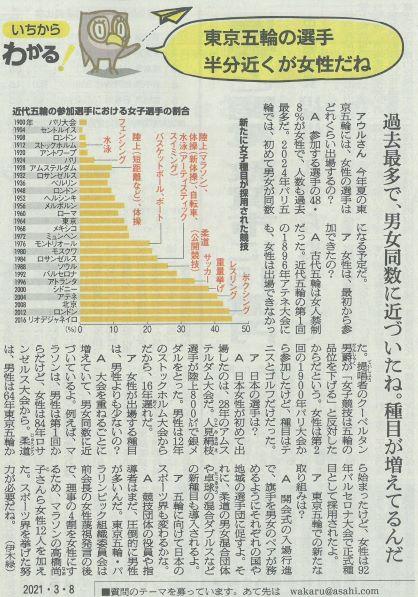 オリンピックでは男女平等 投稿日時 : 2021/03/08 主担 カテゴリ:今日の出来事 (令和3年3月8日 朝日新聞より) 東京オリンピックでは、参加する選手の約半分が女性となります。そもそも古代五輪は女人禁制だったそうで、近代五輪でも第1回は女性は出場できなかったそうです。時代とともに段々と変わってきています。 {{options.likeCount}} {{options.likeCount}}