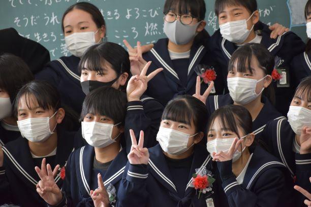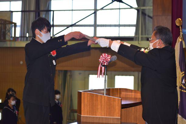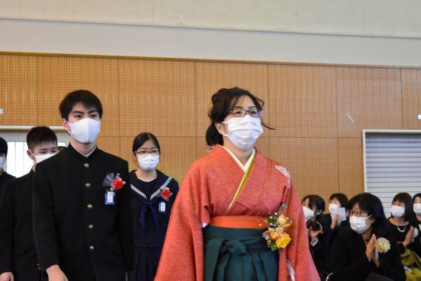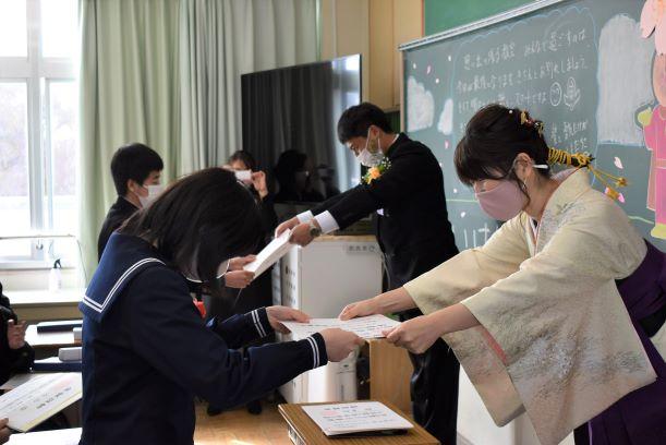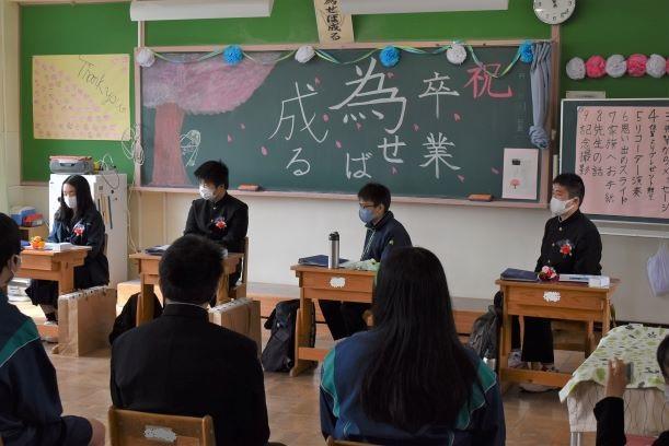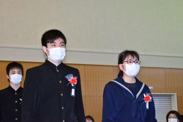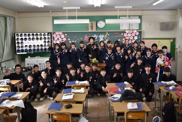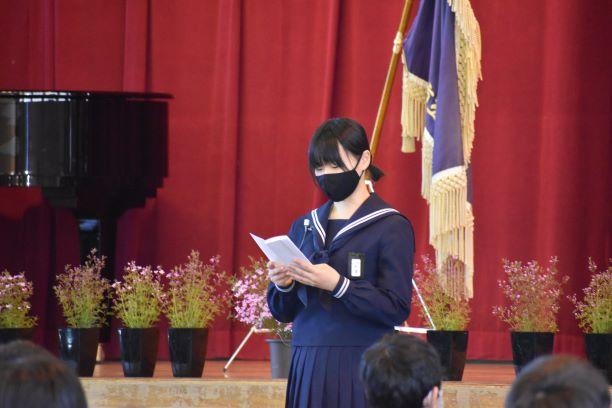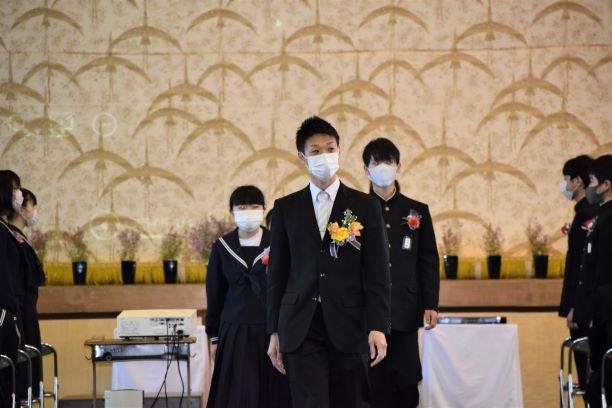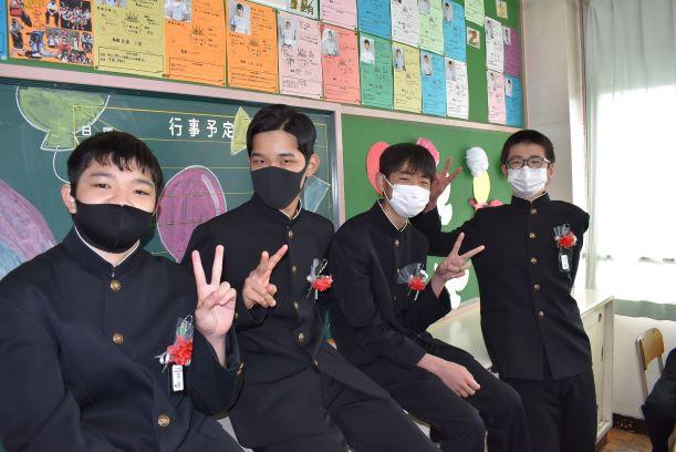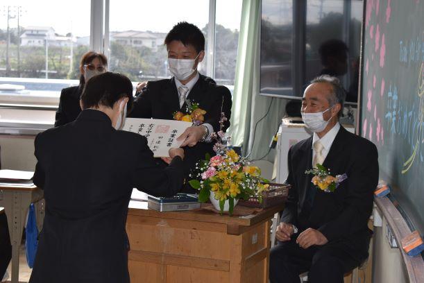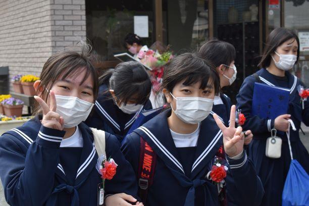 卒業証書授与式挙行しました 投稿日時 : 2021/03/03 主担 カテゴリ:今日の出来事 3月3日、天気も回復し、晴れの門出となりました。卒業証書授与式を挙行しました。卒業生入場、卒業証書授与、校長式辞、在校生代表送辞、卒業生代表答辞、卒業の歌「旅立ちの日に」はビデオでの上映、校歌斉唱と滞りなく、終えることができました。最後の担任の生徒とのお別れの学級活動では、担任から卒業証書を手渡しました。保護者の皆様には、密集を避けられないとの判断で階下の教室から、映像を見ていただきました。ハナモモの花が優しく咲いていました。 {{options.likeCount}} {{options.likeCount}}
