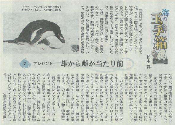 世界中や動物の世界では 投稿日時 : 2021/02/15 主担 カテゴリ:今日の出来事 (令和3年2月14日 中日新聞より) 昨日はバレンタインデーでしたが、みなさんはチョコレートを贈ったり貰ったりしたでしょうか。女性から男性にチョコレートを贈るのは日本だけみたいです。世界中では、男性から女性に花束やカードをプレゼントしたり、食事に誘ったりすることの方が多いみたいです。動物の世界でも、オスからメスへのプレゼントが当たり前のようです。オリンピックの会長辞任で明らかになった男女平等問題は、こんなところにも現れているのでしょうか。 {{options.likeCount}} {{options.likeCount}}