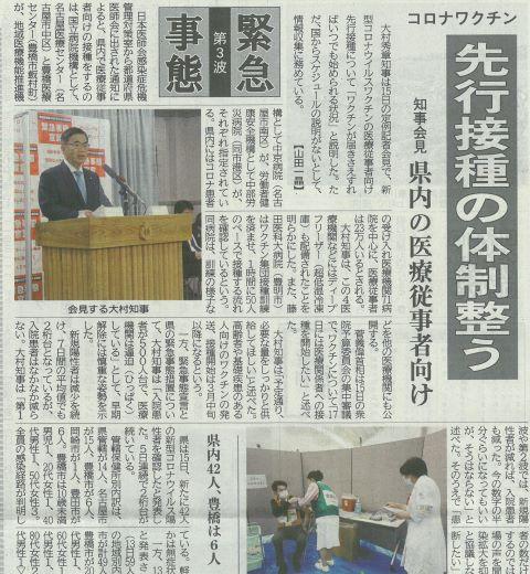 ワクチン接種へ 投稿日時 : 2021/02/16 主担 カテゴリ:今日の出来事 (令和3年2月16日 東愛知新聞より) 愛知県の新型コロナ感染者数が42人ということで減少傾向にあります。そして、新型コロナのワクチンが承認されました。いよいよ医療従事者に向けてのワクチン接種が始まります。 {{options.likeCount}} {{options.likeCount}}