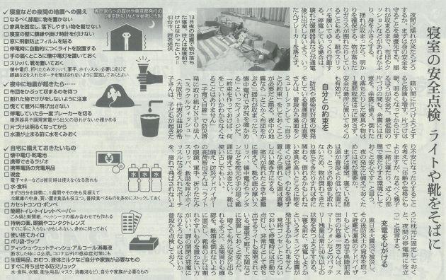 大切な地震の備え 投稿日時 : 2021/02/16 主担 カテゴリ:今日の出来事 (令和3年2月16日 朝日新聞より) 福島・宮城で最大震度6強の大地震が発生しました。夜中の地震ということや、東日本大震災での津波被害があったということで、大きな被害が心配されましたが、不幸中の幸いで亡くなられた方はいませんでした。それは、10年前の経験で、地震に対する備えや、津波の心配はないとの報道はありましたが、夜中でも高台への避難行動をとるという、備える気持ちがあったからです。こちらの地域も南海トラフ地震の危険が叫ばれていますので、備えをしておかなければなりません。 {{options.likeCount}} {{options.likeCount}}