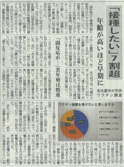 「ワクチン接種したい」7割 投稿日時 : 2021/02/16 主担 カテゴリ:今日の出来事 (令和3年2月16日 東愛知新聞より) 今週から医療従事者に向けてのワクチンの接種が始まります。高齢者の方については4月からとなりそうです。ワクチンは16歳以上が、任意で接種できるそうですが、高齢者になるほど希望が高くなるそうです。10代20代については、死亡リスクが高くないため必要性を感じていないのと、ワクチンの副反応などの危険性を考えてのことでしょう。 {{options.likeCount}} {{options.likeCount}}