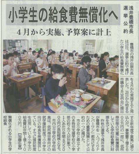 小学生の給食費無償化へ 投稿日時 : 2021/02/17 主担 カテゴリ:今日の出来事 (令和3年2月17日 東愛知新聞より) 今年4月から小学生の給食費が無償化されることになりました。市長の選挙公約となっていました。しかし、同じ義務教育のなのに中学生はどうなるのでしょうか。これからに期待です。 {{options.likeCount}} {{options.likeCount}}