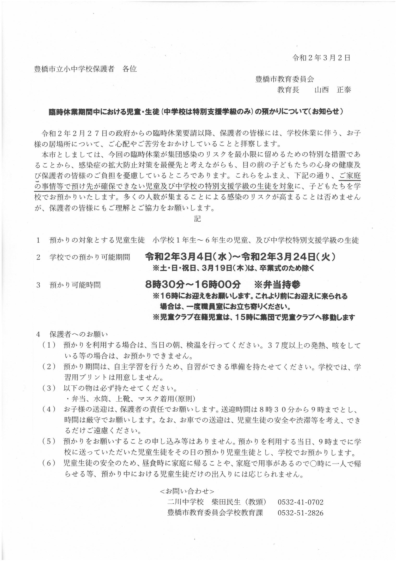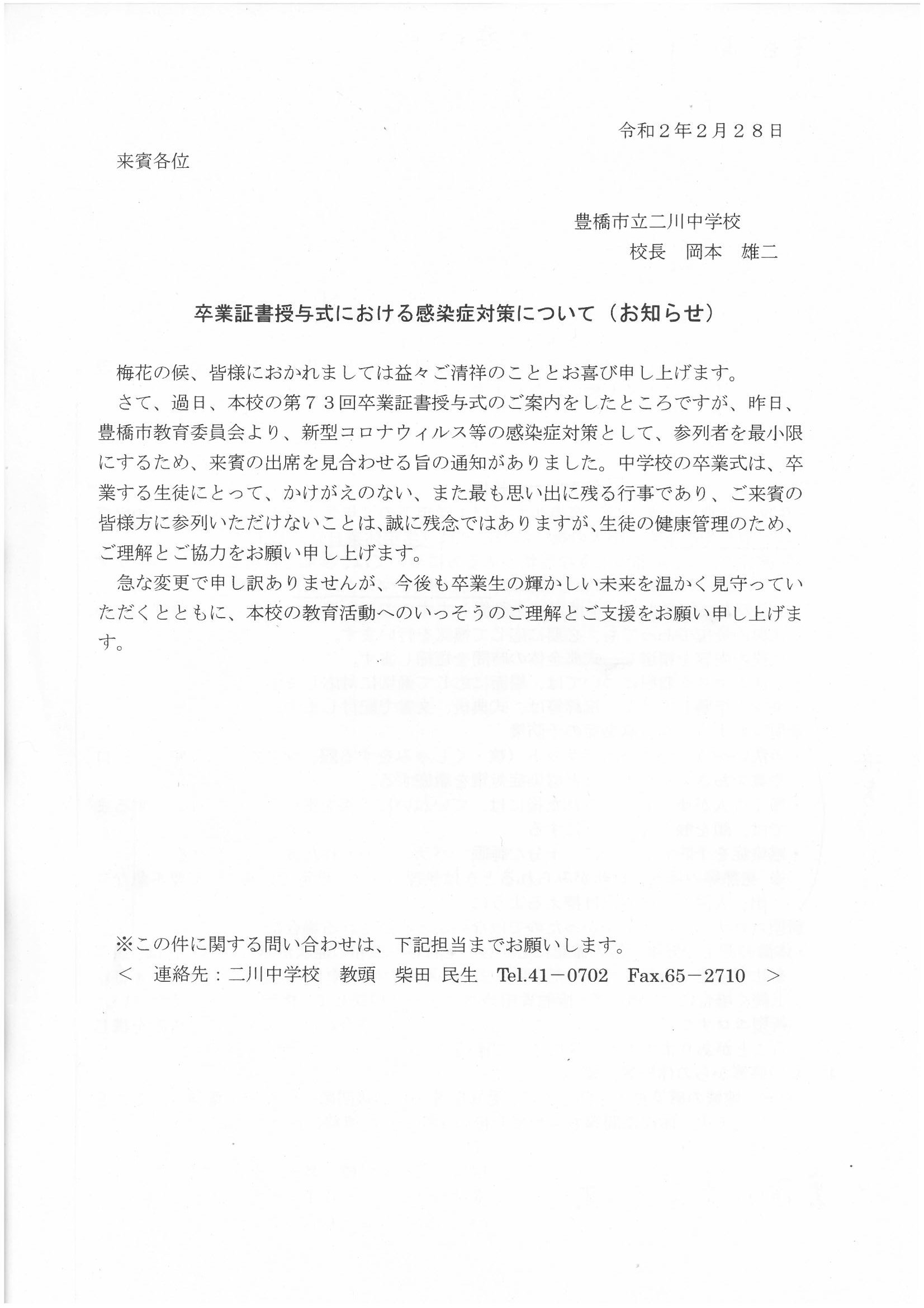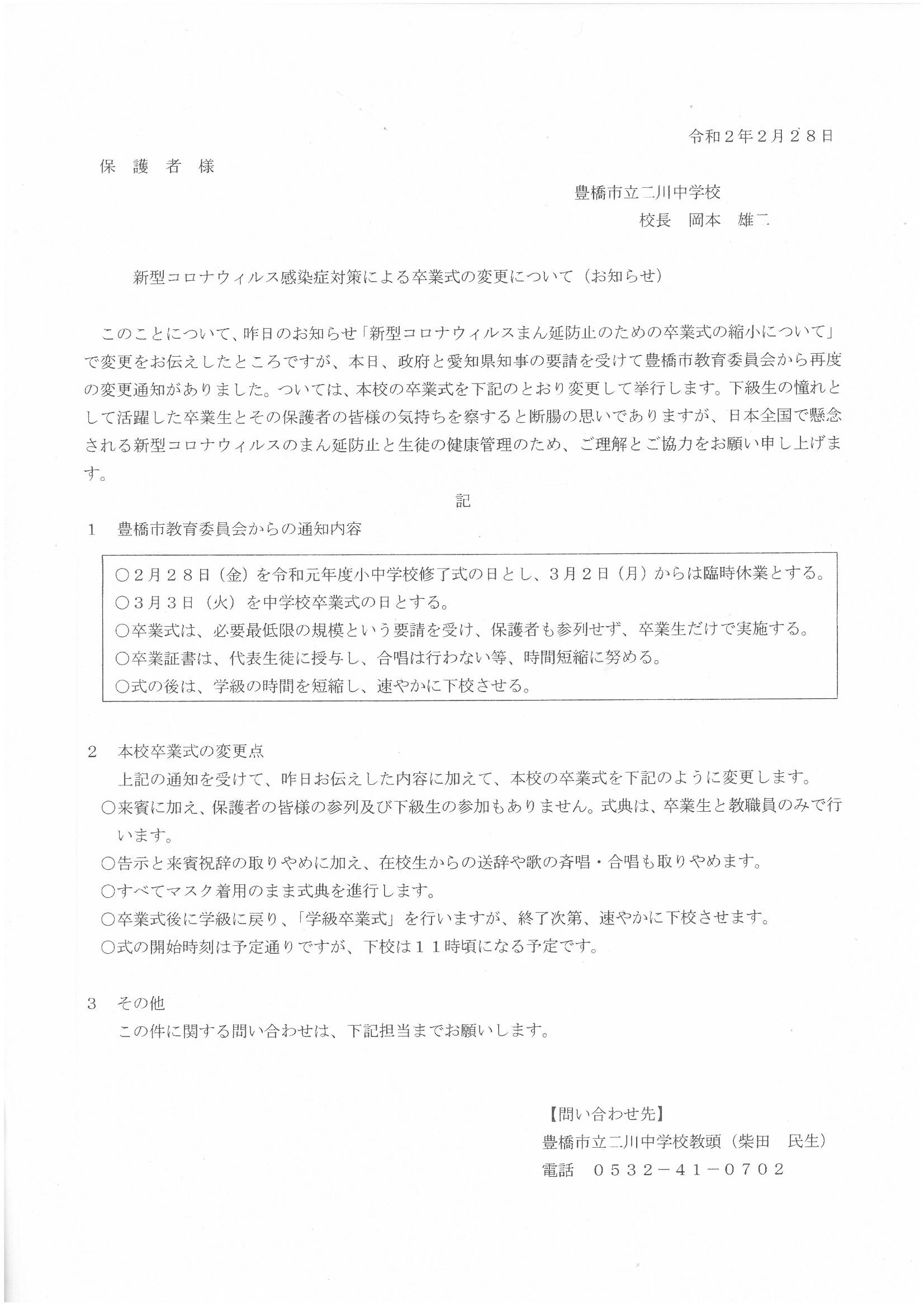 昨日夕方の急な政府の臨時休業の要請を受けて、豊橋市教育委員会から次のような決定が下されました。卒業式についても、昨日までの連絡や計画と異なり、卒業生と教職員でのみ短縮して行うこと。お子様の健康に気をつけていただくことなどが記されています。卒業生にとっては保護者の方に見守られることができず、保護者の方につきましてはお子様の晴れ姿を見ることができず残念だとは思いますが、ご理解のほどをよろしくお願いします。