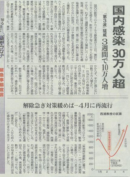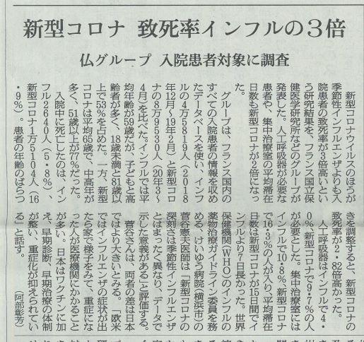 フランス国立保健医学研究所は、新型コロナウイルスの方が、季節性のインフルエンザよりも入院患者の致死率が3倍高いと研究成果を発表しました。新型コロナウイルスが発生してから約1年が経ちますが、日本での1年間の死者数は4000人に達しました。今年はインフルエンザが流行していませんが、毎年インフルエンザによる死者数は日本では毎年4000人程でした。新型コロナウイルスの致死率の高さを考えると、医療機関の頑張りによってなんとか持ちこたえている状況です。このまま感染が拡大し、重症者が増加し、医療機関が逼迫すると死者数が増加する危険があります。