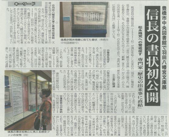 羽田八幡宮文庫展 投稿日時 : 2020/12/24 主担 カテゴリ:今日の出来事 (令和2年12月20日 東日新聞より) 現在、豊橋市中央図書館では、羽田八幡宮文庫展が開催されています。織田信長の書状など初公開の貴重な文献もあります。大河ドラマ「麒麟がくる」の主人公である明智光秀の名前も出てきます。12月27日までの公開となっていますので、冬休みのこの機会に見学してみてはいかがですか。 {{options.likeCount}} {{options.likeCount}}