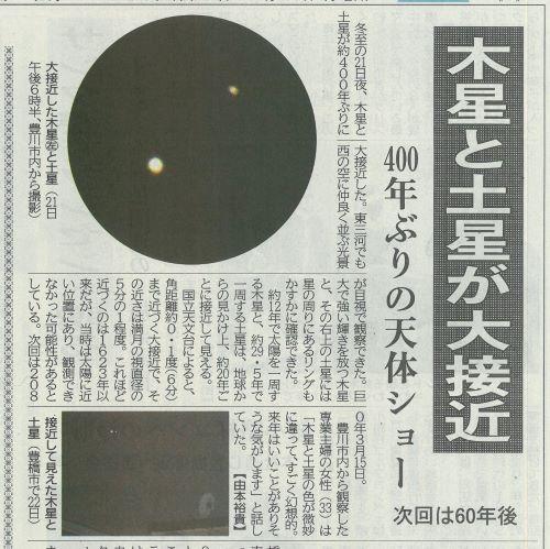 木星と土星大接近 投稿日時 : 2020/12/23 主担 カテゴリ:今日の出来事 (令和2年12月23日 東愛知新聞より) 昨日、木星と土星が接近して見える天体ショーが見られましたが、みなさんは見ましたか。次回見られるのは60年後だそうです。 {{options.likeCount}} {{options.likeCount}}