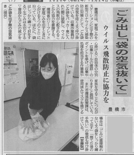 ゴミ出しに注意したいこと 投稿日時 : 2020/12/24 主担 カテゴリ:今日の出来事 (令和2年12月24日 東愛知新聞より) 冬休みになりました。年末ということで、大掃除などを始められる方もいるかと思います。これからゴミの出す量も増えることが予想されます。新型コロナウイルスの新規感染者も増え続けており、ゴミを出すときにも注意しなければなりません。ウイルスの飛散を防止するために、「ゴミ袋の中の空気を抜いて」出すことが大切です。ゴミ収集作業員の方の心配を減らすためにも協力したいです。 {{options.likeCount}} {{options.likeCount}}