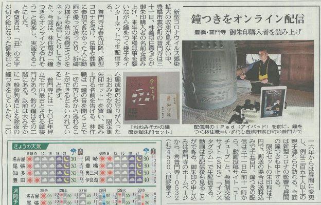 普門寺鐘つきオンライン配信 投稿日時 : 2020/12/24 主担 カテゴリ:今日の出来事 (令和2年12月24日 中日新聞より) 今年は初詣なども新しい様式で行われ、三が日だけではなく密を避けてくるような呼びかけがされています。そんな中で普門寺では、新型コロナの影響で例年行っている鐘つきを中止し、オンラインでの配信を行います。御朱印の申し込みなどもホームページでできるそうです。 {{options.likeCount}} {{options.likeCount}}