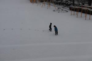積もったばかりの雪の上に足跡が残るのを見て、大喜びしていました。
