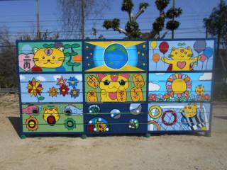 休み時間にも制作し,ふたニャンが描かれた素敵な投てき板を作りました。