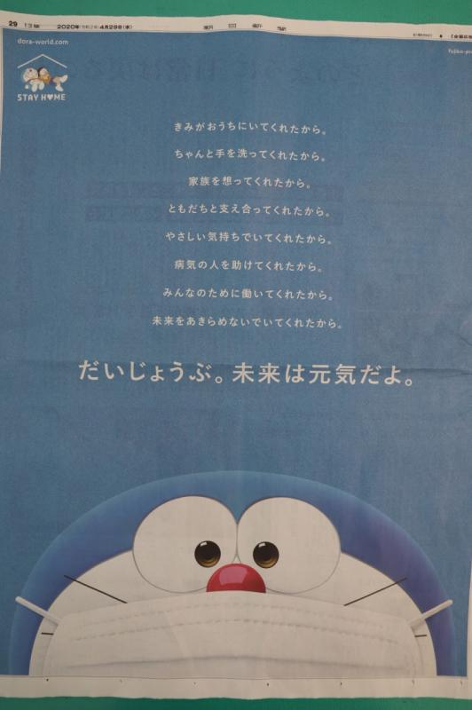 4月29日の朝日新聞に,ドラえもんからのメッセージが載っていました。