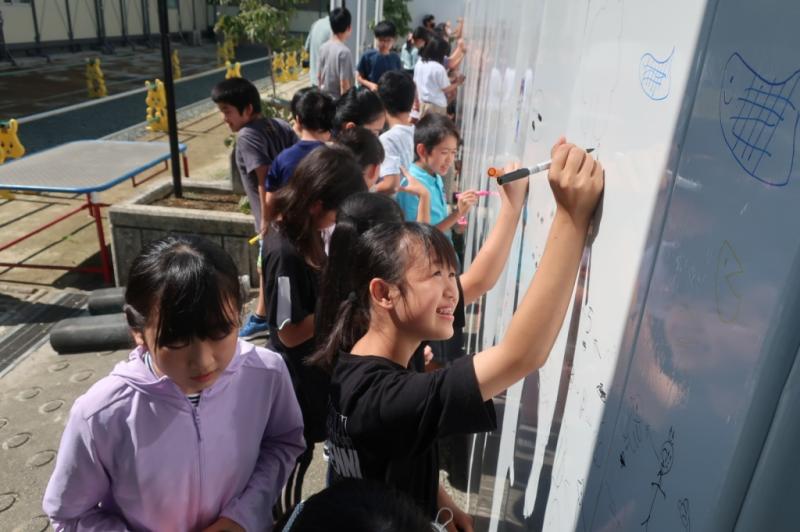 現在二川南小学校の工事をしてくれている方との交流事業として,6年生が「壁アート」を行いました。真っ白だった壁が,色鮮やかになりました。