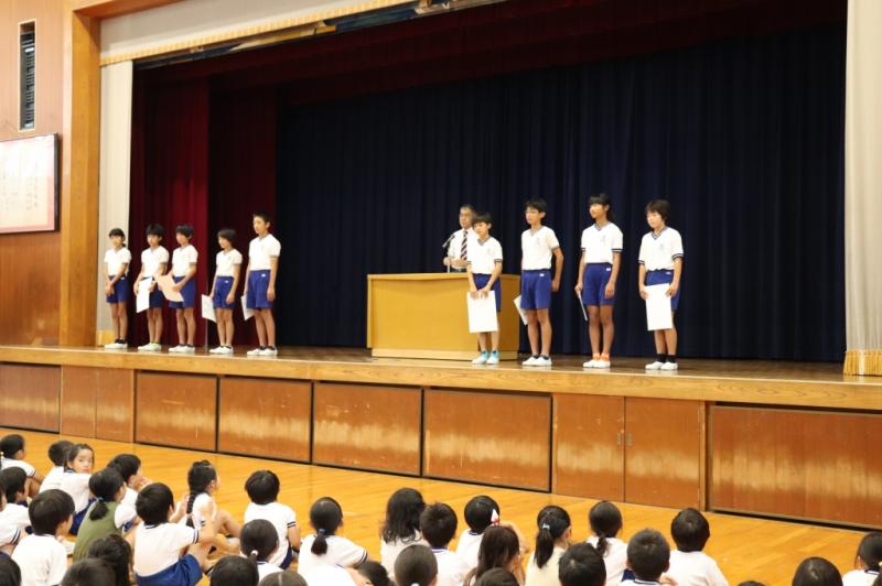 7月9日(火)全校朝会で、陸上部の表彰が行われました。先日の陸上競技大会ですばらしい成績をおさめた9人が表彰されました。表彰された子のほかの部員も練習をがんばり、陸上部全員で勝ち取った成績です。(男子総合6位 女子総合5位)