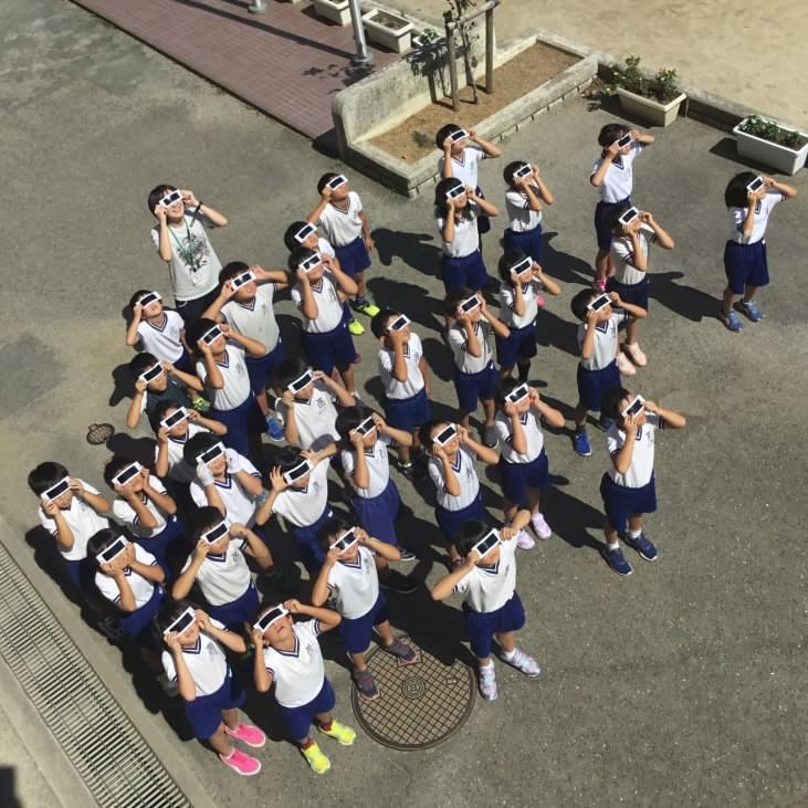 直接見ると目を痛めるので,遮光板を使って〇〇を観察しています。