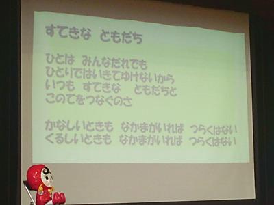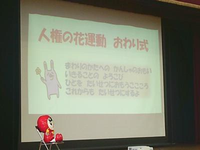 人権まもる君、と人権あゆみちゃんも登場し、子どもたちによる人権標語の発表や児童代表のことば、全校合唱「すてきなともだち」を行いました。