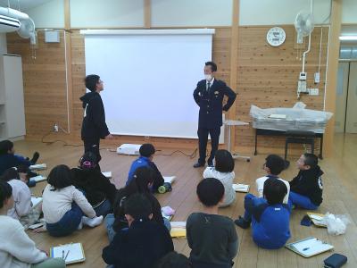 多目的室でお話を伺い、犯人逮捕の時に、通報から逮捕までどのような動きになるかのビデオを見ました。