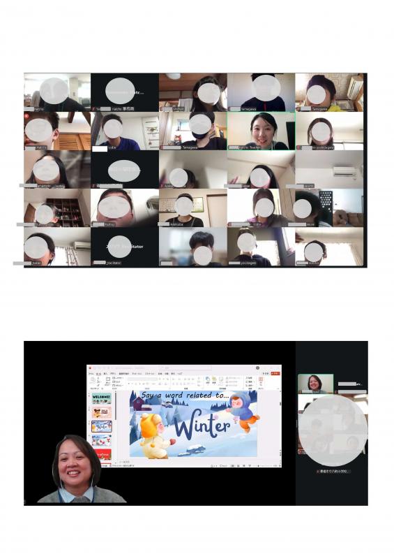ほとんどの児童が自宅からの参加です。まず、操作の仕方やルールなど簡単なガイダンスを行い、その後、6つのグループ(ブレイクアウトルーム)にわかれて、本校のNET(ネイティブイングリッシュティーチャー)がファシリテーターを行い、自己紹介や学校紹介、好きな食べ物など簡単な英会話を行いました。