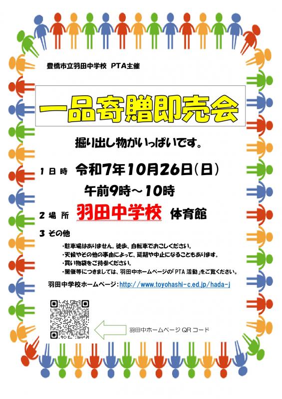 令和4年10月30日(日)PTA一品寄贈即売会を開催する予定です。詳しくは、下のPDFをご覧ください。