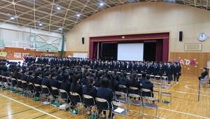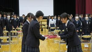 任命式の前には表彰を行いました。軟式野球部、駅伝部女子、陸上競技部、読書感想文コンクールなど、多くの人が表彰されました。また、英語スピーチコンテストに参加した3年生の立松さんが、スピーチを披露しました。