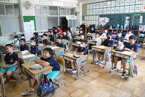 9月1日(金) 明るく元気な花田っ子が学校に帰ってきました。全校放送による2学期始業式を行いました。式では、代表の子が2学期の抱負を力強く語りました。自分の目標の実現に向けてがんばってください。応援しています。