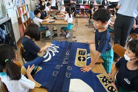 3年生が山佐染工所の見学をした際に、代表児童が糊付けをした帆前掛けが完成し、6月に届けていただきました。「創立150周年記念」の文字が入った特別なデザインです。見学の機会をつくっていただいたことに加えて、このような立派な帆前掛けを子どもたちに贈っていただきました。山佐染工所の皆様、ありがとうございました。