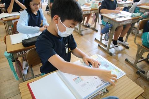 6月21日(水) 3年生が社会科学習の一環として、校区の山佐染工所の見学へ行きました。山佐染工さんが、花田小創立150周年を記念したデザインの型紙を用意してくださり、代表児童が糊付けを体験しました。どの子も山佐染工での作業工程に興味津々で、「なぜ糊付けをするのか?」「なぜ手作業で行うのか?」など疑問に思ったことをすすんで質問し、学びを深めていました。世界に一つしかない特別なデザインの帆前掛け。完成が楽しみですね。