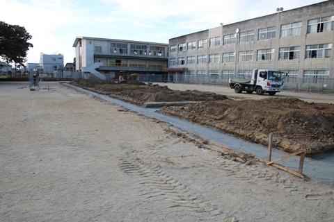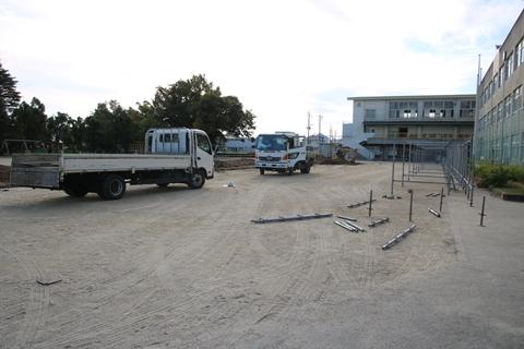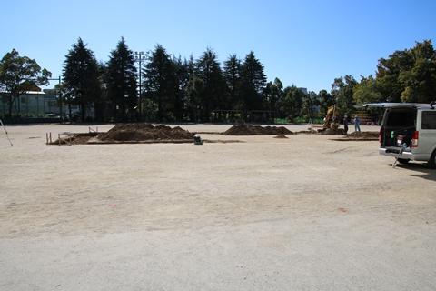 初めに10月26日(木)までの3日間、運動場にプレハブ仮設校舎建築のための基礎工事や柵を設置する工事を行います。運動場が狭まり、利用できない場合があります。子どもたちや皆様に不自由をかけますが、安全に工事を進めるために必要なことですので、ご理解とご協力をお願いします。