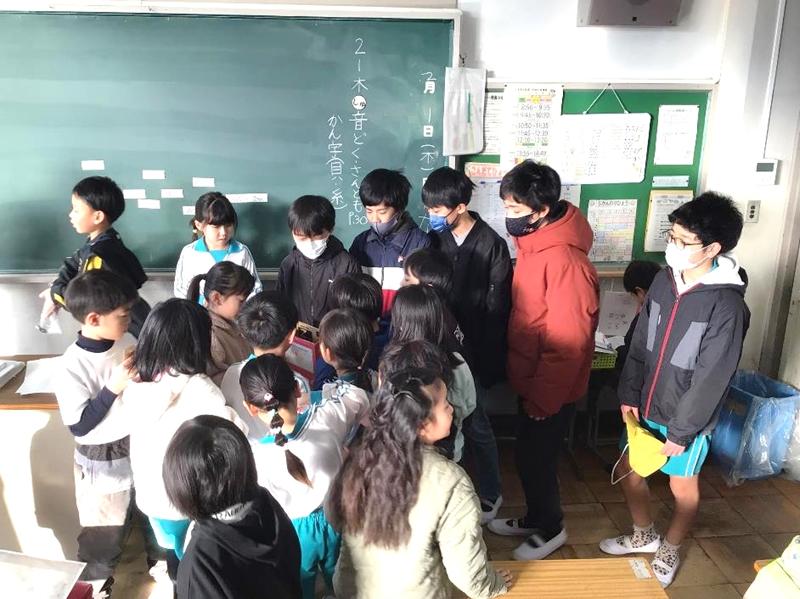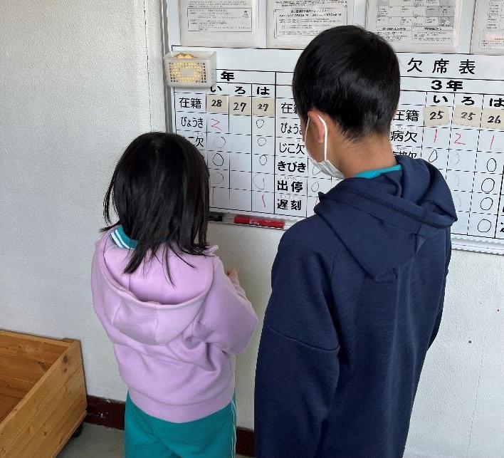 2月1日(木) 各学級の保健係が、毎朝、出欠席黒板の記入をしています。この日は、1年生の保健係が記入している横で、6年生がやさしく見守り、書き方のアドバイスをしていました。このようなふれ合いや交流が学校生活のさまざまな場面で見られます。