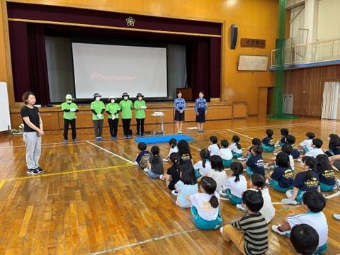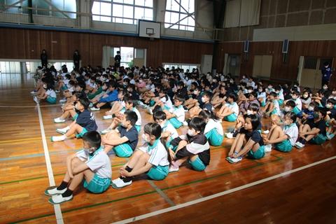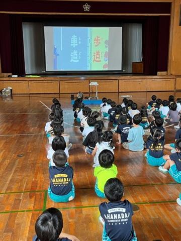 5月30日(火) あいにくの天候で、実際の歩道・道路での活動はできませんでしたが、体育館で市の生活安全課の方や交通安全指導員の近田さん、百度町・小林自治会長さんなどから安全な道路の渡り方や歩き方などを教えていただきました。1年生はとてもよい姿勢で、しっかりとお話を聞くことができました。