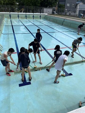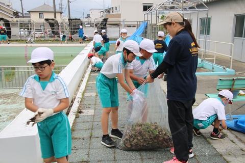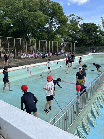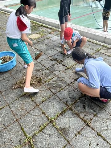 5月26日(金) 午後からの6年生のプール清掃のために、朝から用務員の渡邉さんが準備をしてくれました。5・6時間目は、ブラシやたわしでプール内の汚れ落としと、プールサイドの草取り・コケ取りです。夢中になるあまり、ずぶ濡れになる子もいました。
