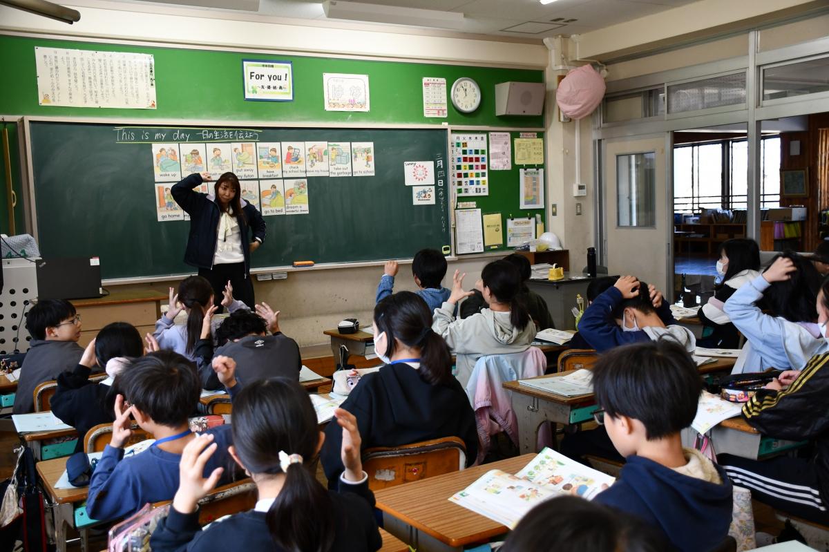 今日は,SAの先生といっしょにやる英会話授業が最後でした。”I wake up.”から始まり,”I dream wonderful deram."まで,一日の生活をジェスチャーを使いながらみんなで楽しく伝えました。4年生は、3年生のときからいっしょに勉強してきました。この2年間で,自分のことを自信をもって英語で話せる子が増えました。5年生からはALTの先生との授業がスタートです。これからも英語の授業,楽しみですね。