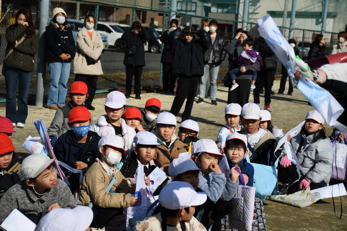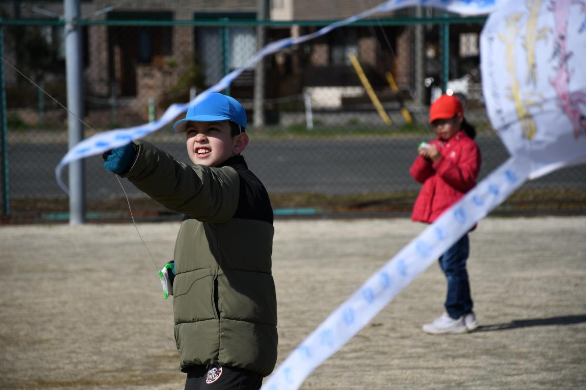 2年生が授業で制作した凧を空に飛ばしました。風の強い日だったので空高く凧が舞っていました。楽しそうに凧を上げる2年生の子どもたちがたくさんいました。
