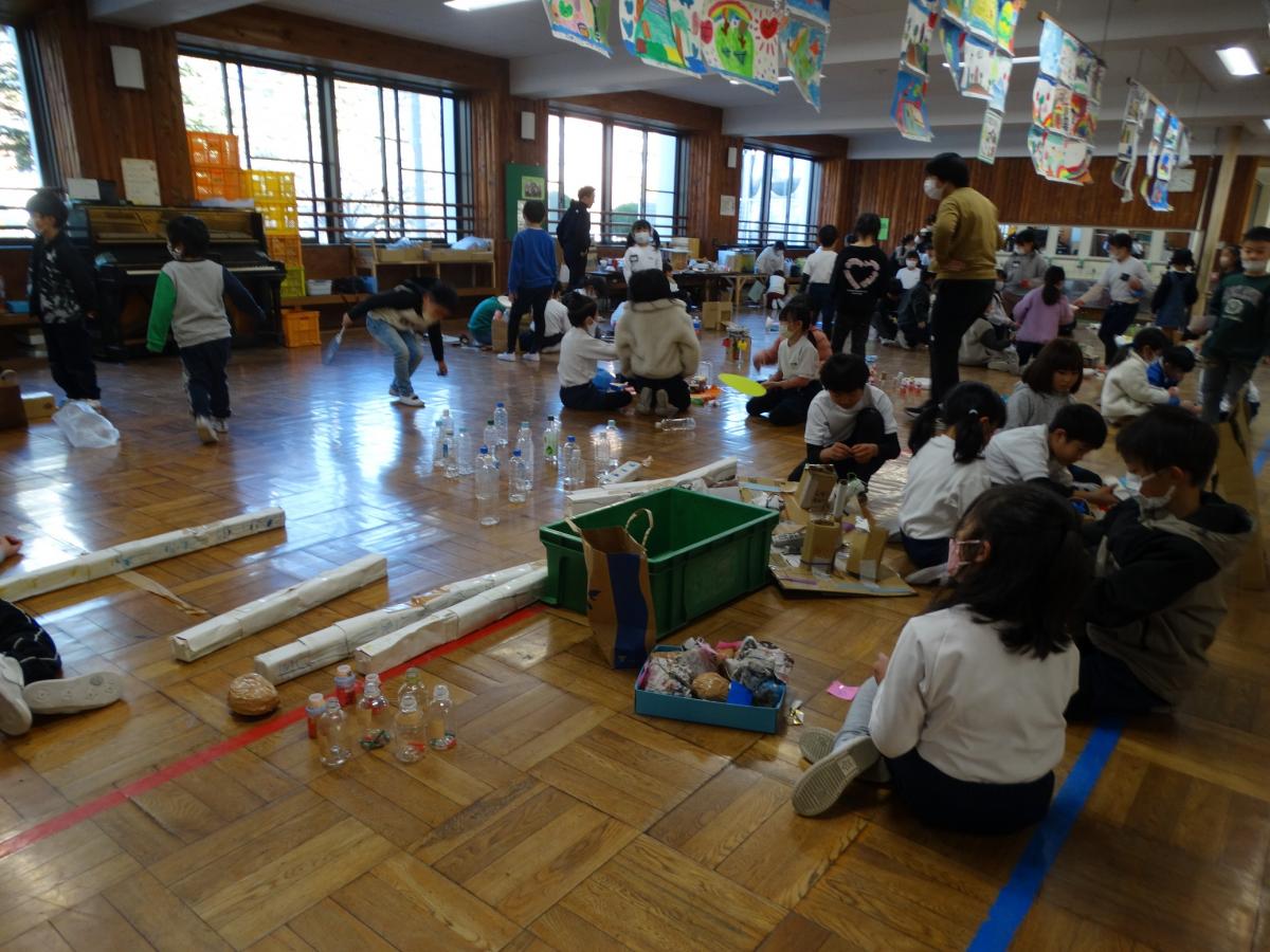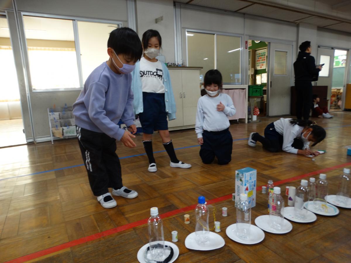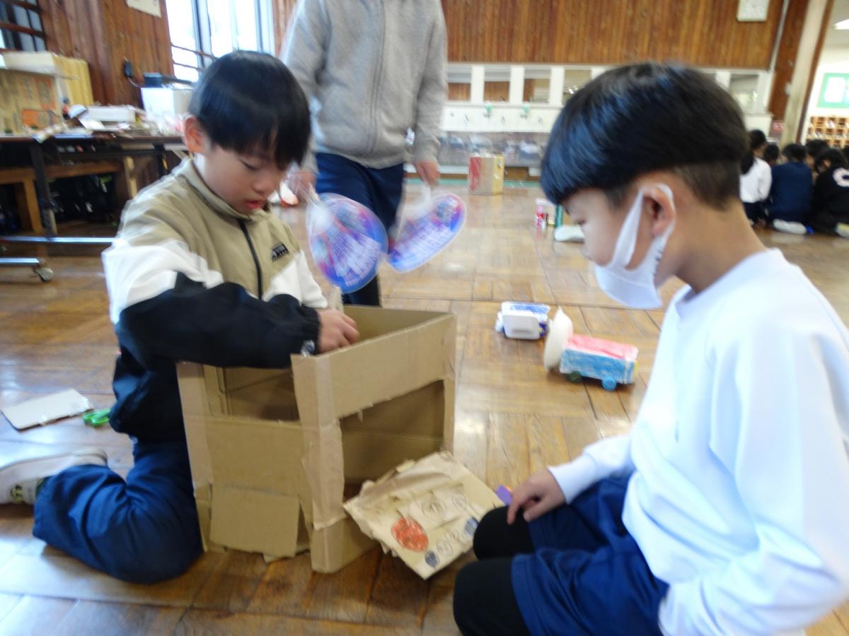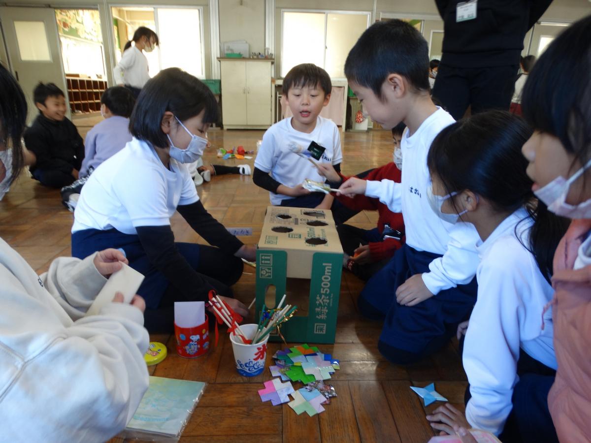 2年1組の児童が1年1組を招待して,おもちゃランドで一緒に遊びました。2年1組の児童が一生懸命作ったおもちゃで1年生の児童を楽しませました。1年生の児童も楽しく遊ぶことができました!