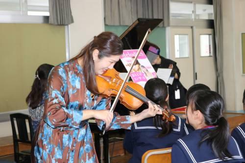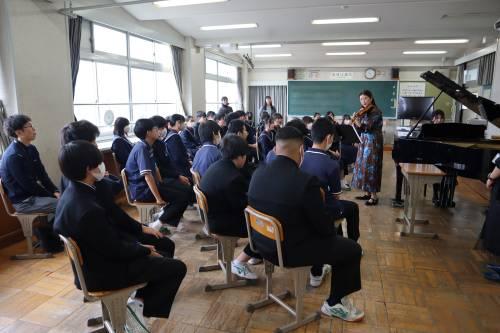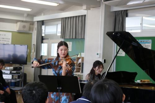 ヴァイオリンとピアノのデュオ「MelodiaS」をお迎えして,おとどけコンサートを行いました。2年生がクラスごと,音楽室で音楽を聴きました。