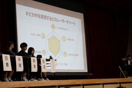 全校アンケートの中に「#ピカ中が抽象的でわかりにくい,#ピカ中になれているのかどうか基準がないからよくわからない」という回答がありました。これを受け,「#ピカ中にUPATE ~ピカレーダーチャートで#ピカ中見える化大作戦~」という議題で生徒総会を行いました。