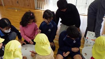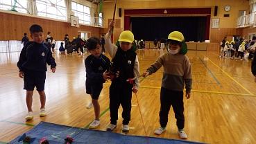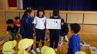 12月1日(月)の1時間目に、石巻保育園の園児を招待して「あきのおもちゃまつり」を体育館で行いました。1年生は10月から準備を始め、どんぐりや松ぼっくりなどを使い、保育園の子たちが楽しく遊べるおもちゃを一生懸命作りました。当日は「すすんで声をかけて教えてあげる」ことを目標に、どの子も積極的に関わることができました。園児たちも笑顔で交流する姿が見られ、大成功に終わりました。