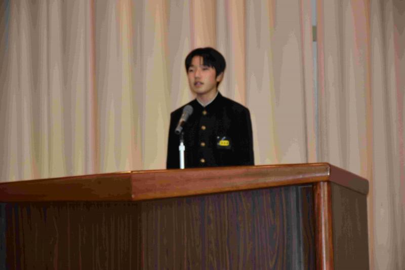 2学期終業式です。全校生徒が、久しぶりに体育館に集まりました。キンと冷えた体育館に静寂が広がります。まず、各学年の代表生徒が振り返りと今後の抱負を発表しました。行事の多かった2学期でしたが、それだけに生徒の成長や笑顔も多くみられる実りある時間であったことが生徒の発表からも伝わってきました。