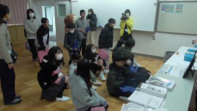 南校舎の2階「学びの空」では、各クラス2グループに分かれて学びを深めました。青いゴーグルをのぞきこむとVR技術により、映像で地震を体験できます。テーブルに並んでいたお茶碗が一斉に自分に向かって転がってきます。大地震では、グランドピアノが自分に向かってくると聞いたことがありますが、そんな危険性を体感できる映像技術でした。