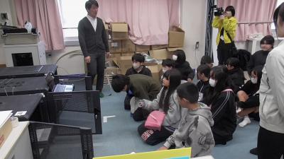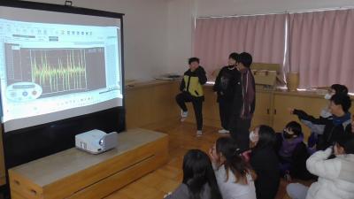 こちらは磯辺小の校舎の床や壁に設置されている「揺れ」を感じるセンサーの体感実験です。センサーの近くでジャンプすれば、振動を波形で見ることができました、大きな声による「振動」もキャッチできました。こうしたセンサーにより、地震による建物のゆがみをとらえます。