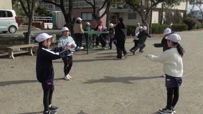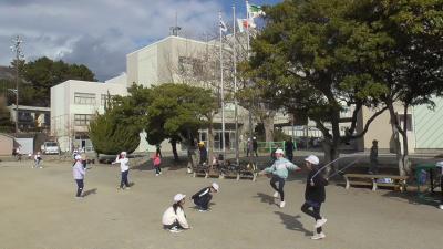 寒さが厳しくなるにつれて、なわとびをする子も多くなってきました。4人で円になって、種目を決めて跳んでいました。引っかかったら座るという体育の授業のルールを自分たちにも取り入れて楽しんでいます。