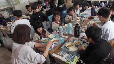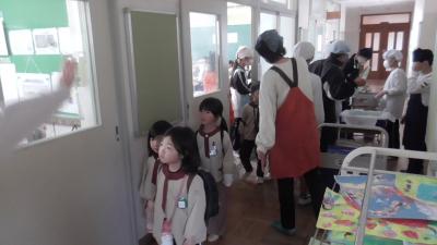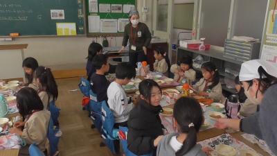 2月26日の給食時に長栄保育園や他園に通う年長児が磯辺小を訪れ、来年度から始まる給食の体験に来てくれました。この日のメニューは、中華風炒め煮と青じそ入り春巻き、ごはん、牛乳などでした。炒め煮には磯辺っ子が愛するうずら卵、春巻には青じそと豊橋が誇る特産品が使われ、豊橋の学校給食の特徴をしっかり味わえるメニューでした。